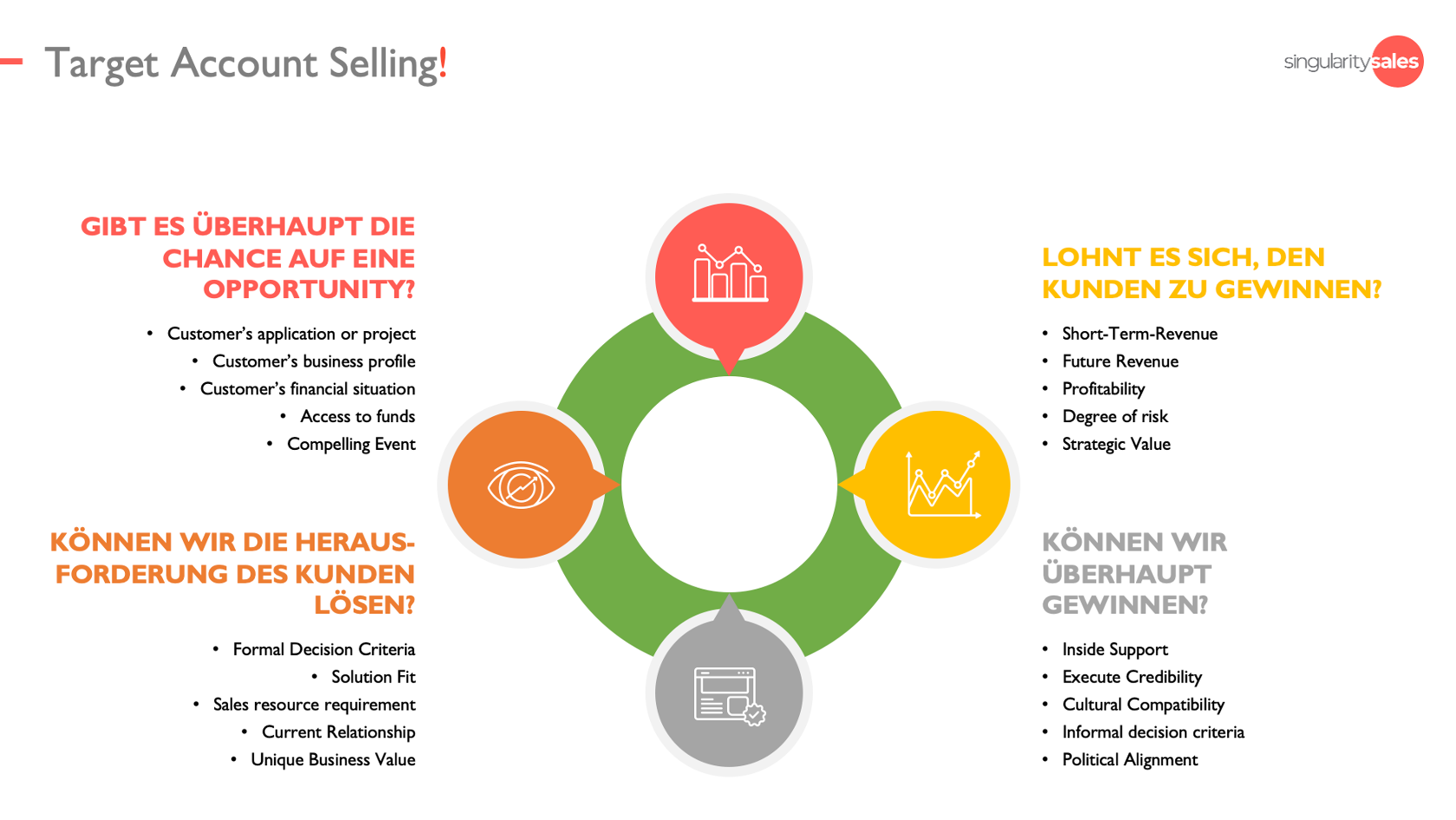Denkt daran, dass es eine feine, aber deutliche Grenze zwischen der Generierung eines angemessenen Volumens an Opportunities und der Generierung der richtigen gibt. Bei Target Account Selling (TAS) dreht sich alles darum, eure erstklassigen B2B-Sales Ressourcen ins Rennen schickt, daher ist die Recherchephase von größter Bedeutung.