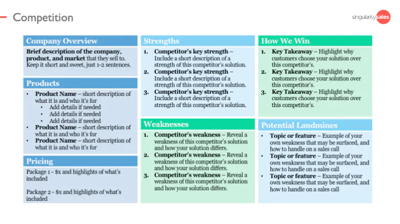 Sobald ihr einen umfassenden Einblick in die Angebote des Wettbewerbs erhalten habt, solltet ihr darüber nachdenken, eine Angriffsstrategie zu formulieren. Eine Angriffsstrategie ist wie ein einseitiger Spickzettel, der die wichtigsten demografischen Merkmale, Stärken und Schwächen der Konkurrenten aufzeigt.