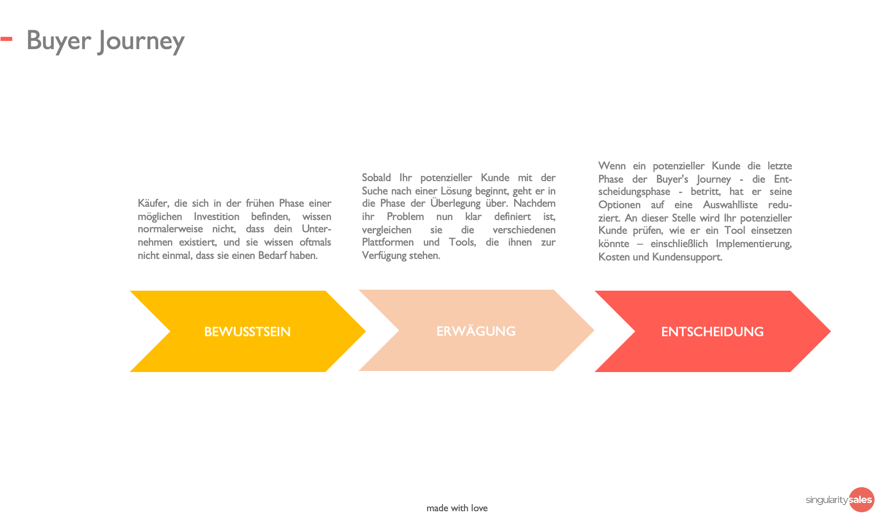 Da Du nun eine bessere Vorstellung davon hast, wer Dein Käufer ist, kannst Du Deine Interessenten besser verstehen, wenn Du weißt, in welcher Phase der Buyer's Journey sich diese befinden.