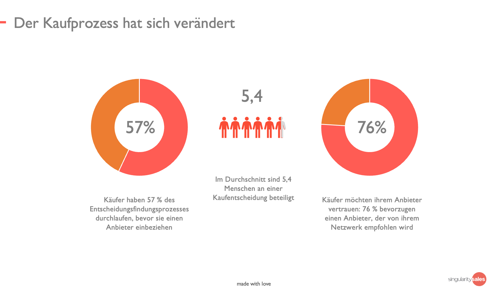 Der B2B-Verkaufszyklus ist mitunter recht lang – und an einer einzigen Kaufentscheidung sind durchschnittlich 5,4 Personen beteiligt. (Wenn also eure Kunden multinationale Konzerne sind, die in ihren Unternehmen viele Hierarchien haben, könnte man auch mit noch mehr Bürokratie im B2B-Verkaufsprozess rechnen).