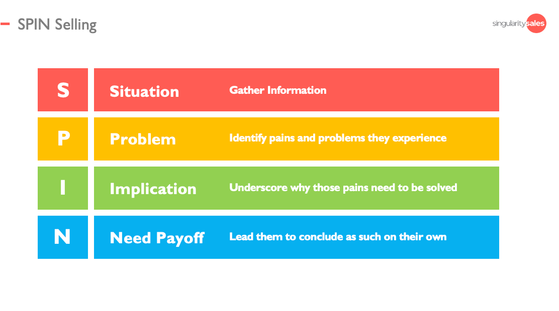 Die Methode wurde erstmalig 1988 von Neil Rackham vorgestellt. Es wird ein Rahmen vorgegeben, der dabei hilft, die richtigen Fragen für einen kundenzentrierten Vertrieb zu entwickeln. Die „SPIN Selling“ Methode zeigt B2B-Vertriebsmitarbeitern außerdem, wann man diese Fragen stellen sollte. Diese Fragen ergeben sich aus den vier Kategorien, die sich aus dem Akronym SPIN ergeben: