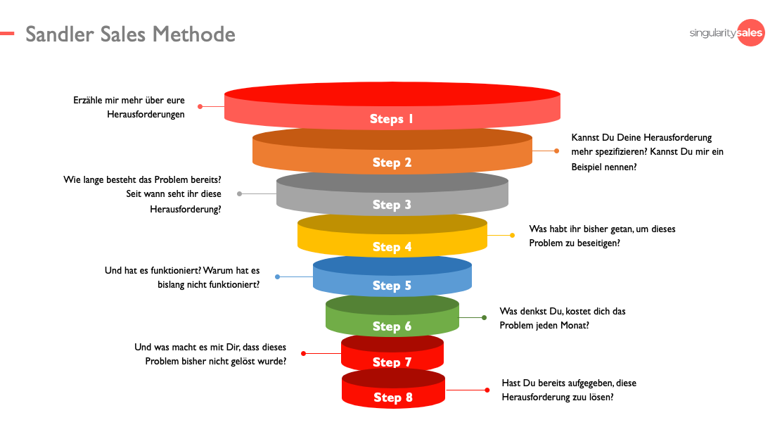 Ein wichtiger Bestandteil dieser Vertriebsmethode ist, potentielle Kunden mit Fragen zu ihren eigenen Schlussfolgerungen und Lösungen zu führen.