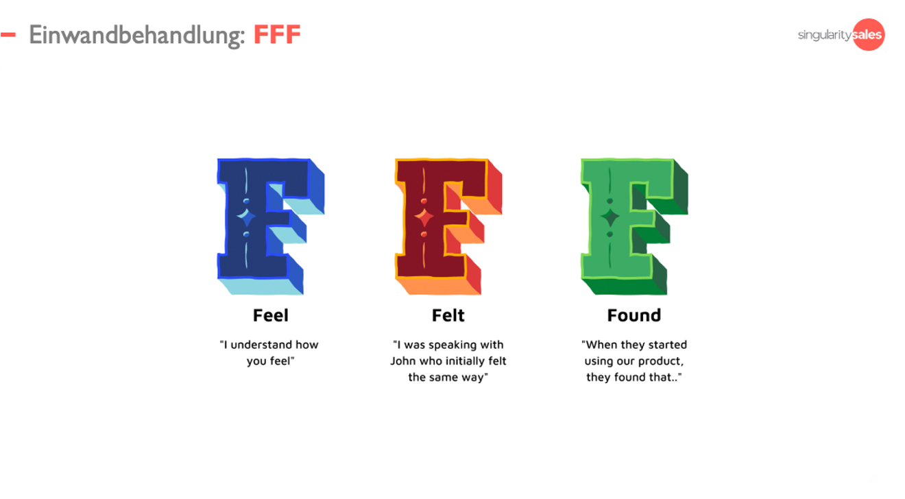 FFF ist eine klassische und zunehmend angewandte Einwandbehandlungstechnik im B2B SaaS Vertrieb. Es funktioniert wie folgt: