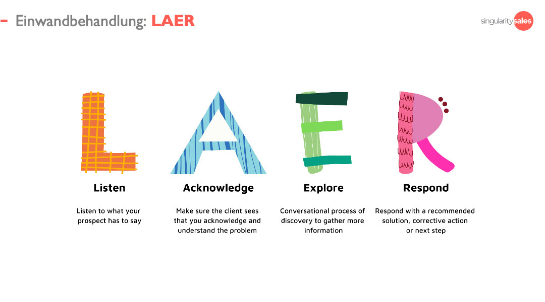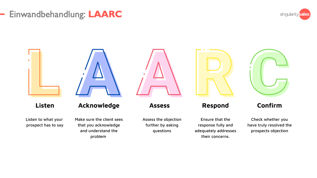 LAARC ist eine heute verwendete Standardstrategie zur Minderung von Einwänden im B2B SaaS Vertrieb. Bevor ein Einwand behandelt wird, sollte diese Methodik sorgfältig seziert werden.