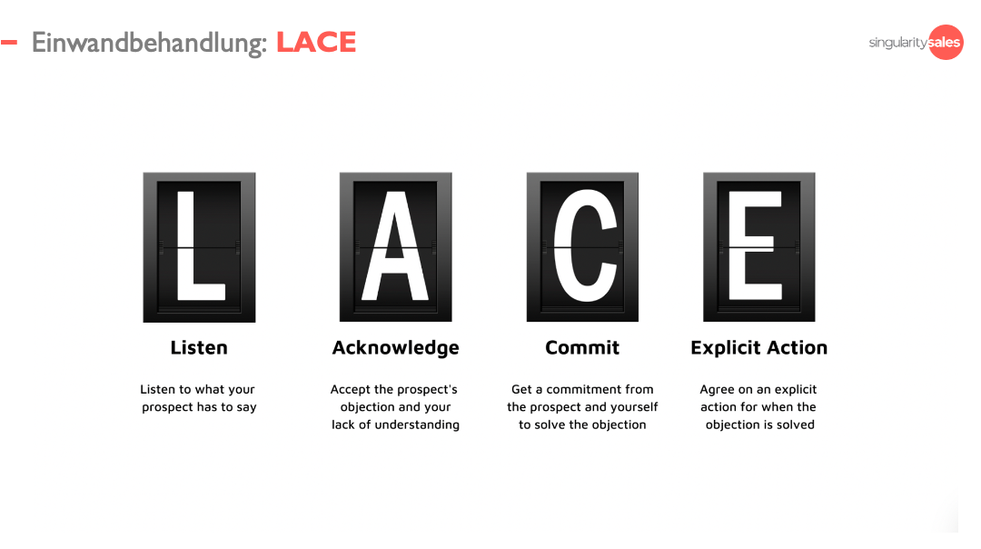 Genau wie LAARC beginnt LACE mit Zuhören und Bestätigen. LACE schlägt jedoch vor, dass Du einen Probeabschluss machst, nachdem Du den Einwand verstanden und anerkannt hast.