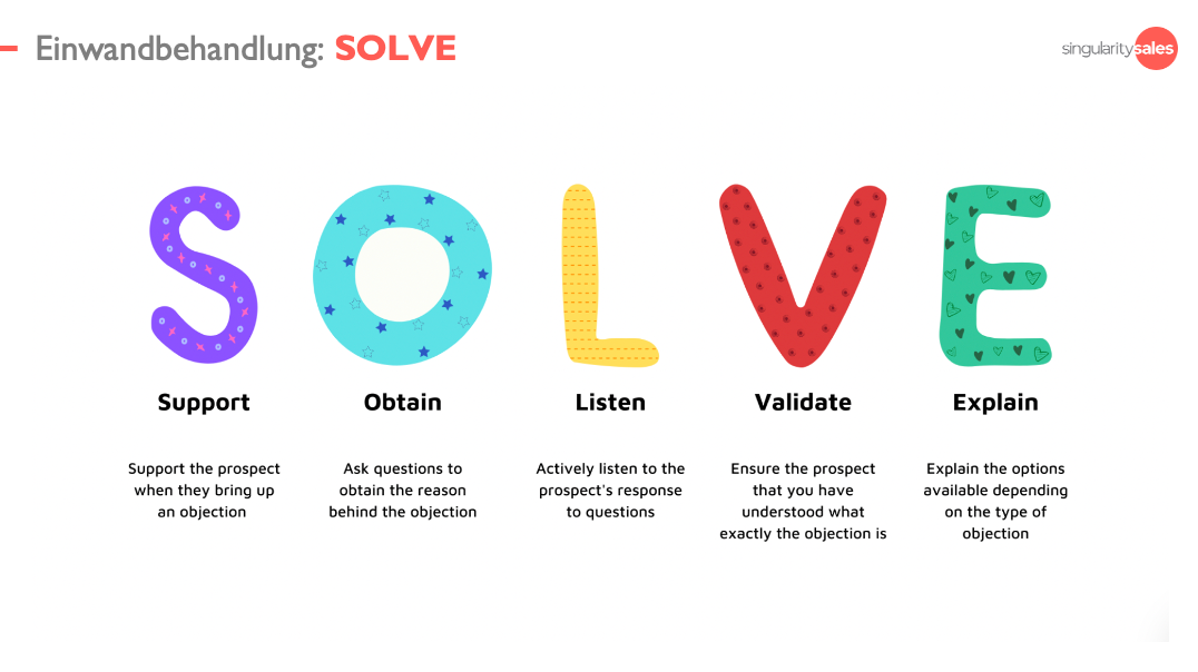 Die SOLVE-Methodik sagt, dass Du den Interessenten unterstützen solltest, wenn er Einwände erhebt. Das Erkennen des Einwands lindert nicht nur anfängliche Verlegenheit, sondern schafft auch Vertrauen und Glaubwürdigkeit ("Support").