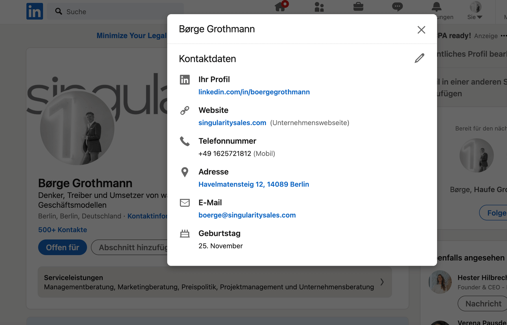 #1 = Die Kontaktdaten (Mail, Mobilnummer, Office-Nummer) Deiner Zielperson sind nun ersichtlich. In der Realität ist das aber nur in 30-40% aller Fälle der Fall. Findest Du die Kontaktdaten, dann anrufen oder eine Mail senden (Achtung: DSGVO beachten)
