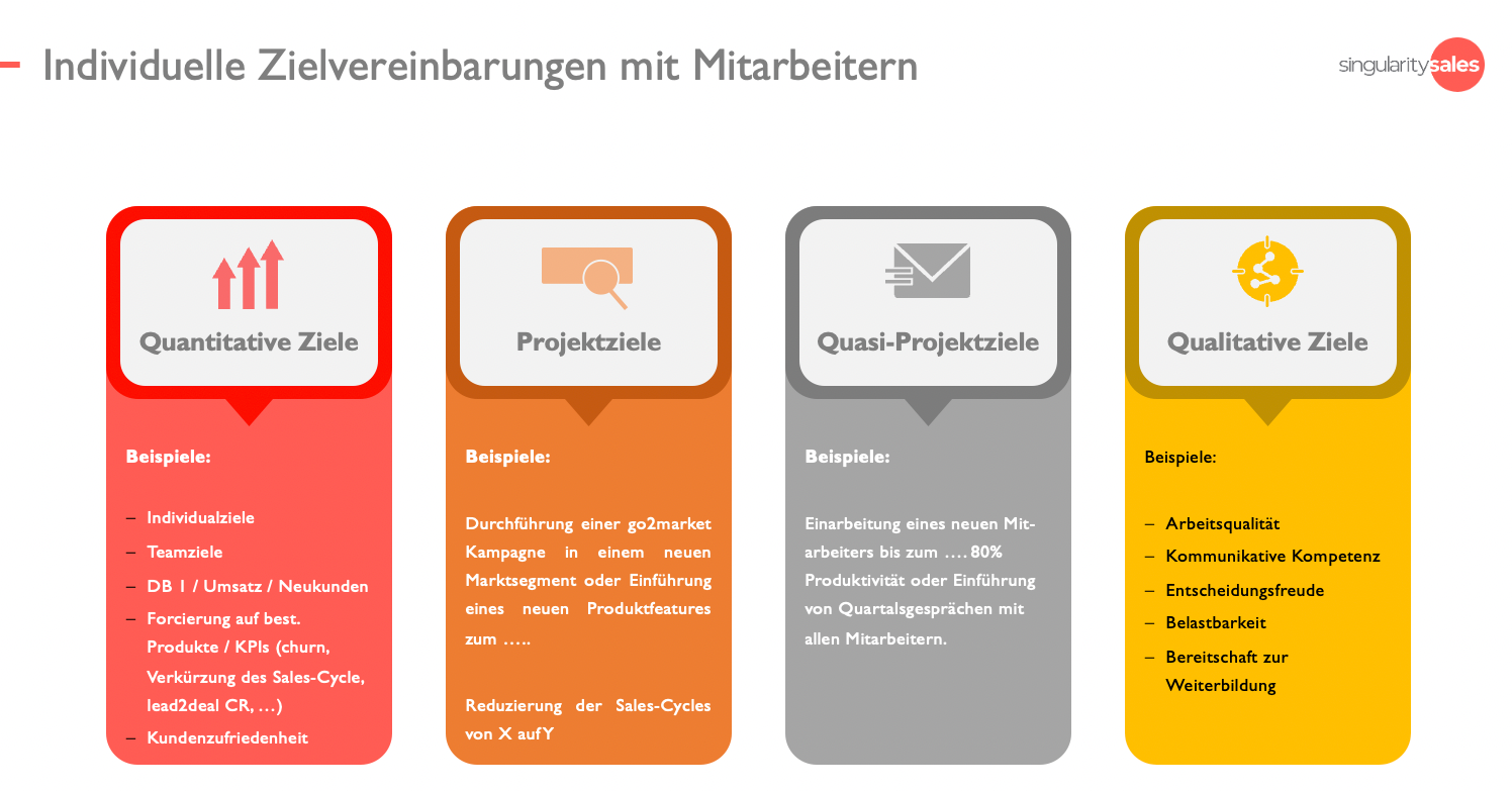 Darüber hinaus vereinbart die Führungskraft mit dem Vertriebsmitarbeiter qualitative Ziele, welche im Kontext der individuellen Entwicklung des Mitarbeiter stehen und sich mittelbar auf die operativen und strategischen Ziele des Unternehmen auswirken können, sofern die Ziele auch erreicht werden. Diese qualitativen Ziele sollten im Idealfall vom Mitarbeiter kommen, wenn überhaupt, dann anmoderiert durch die Führungskraft - siehe dazu: