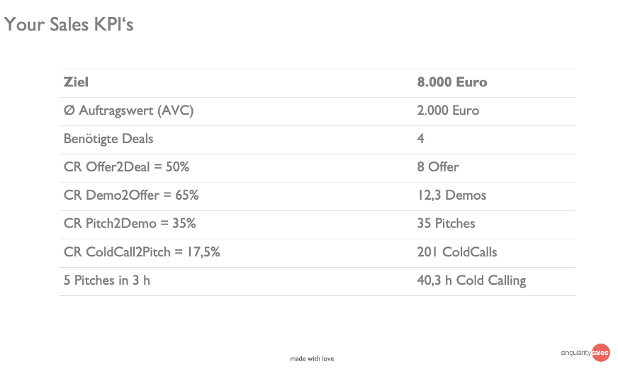 Aus Erfahrung weißt Du, Deine CR Offer2Deal = 50%, dann weißt Du, Du 8 qualifizierte Angebote schreiben. Deine CR Demo2Offer liegt bei 65%, dann weißt Du, Du benötigst 12,3 Demos. Deine CR Pitch2Demo beträgt 35%, dann musst Du 35 Pitches machen. Deine CR ColdCall2Pitch beträgt 17,5%, dann musst Du 201 ColdCalls machen.
