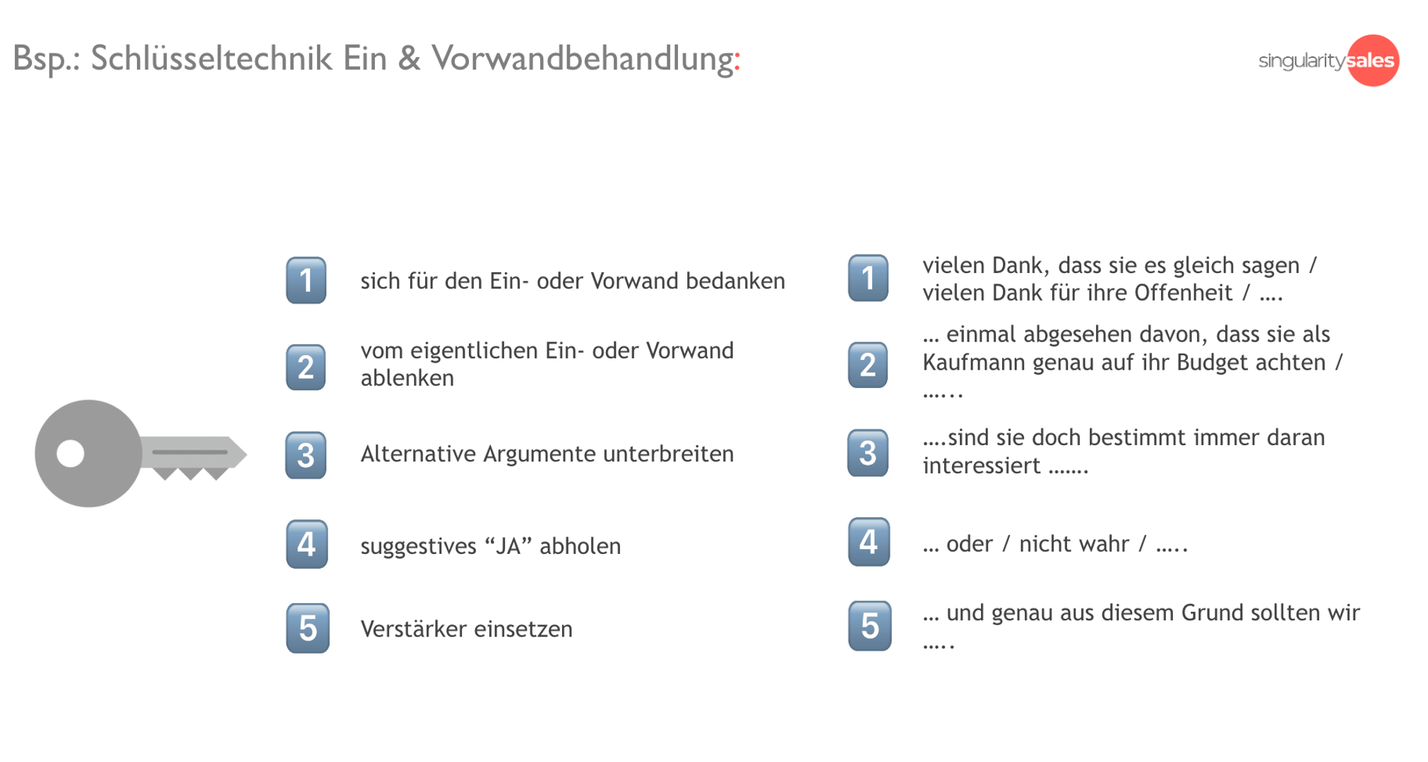 Wenn Ihr noch heute damit beginnen möchtet, die Vorteile von Sales-Hacks zu nutzen, ist die Perfektionierung eurer Einwandbehandlung ein guter Anfang. Wenn Ihr lernt, effektiv mit Einwänden potenzieller Kunden umzugehen, könnt Ihr mehr Deals abschließen und mehr Provisionen verdienen. Eine gute Methode für die Ein- und Vorwandbehandlung ist die Schlüsseltechnik.