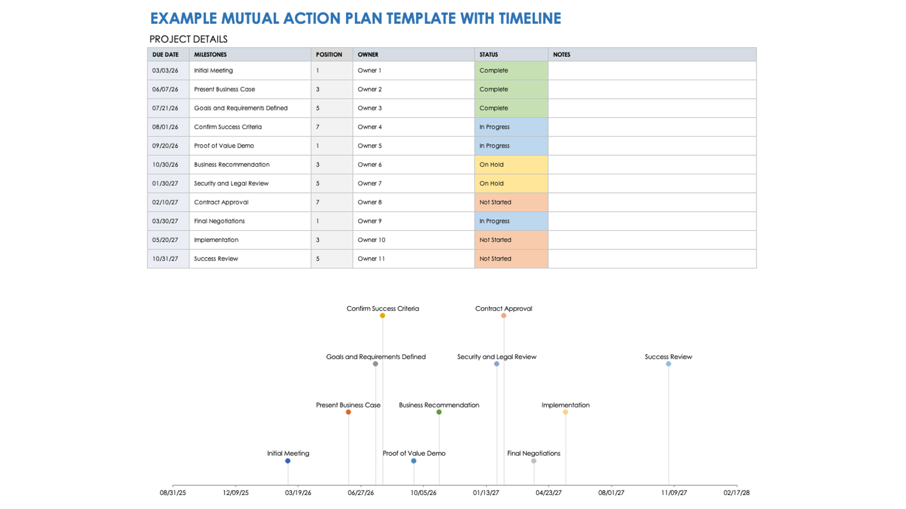 Es macht keinen Sinn, einen gemeinsamen Aktionsplan zu besprechen, bis ein Käufer zugestimmt hat, dass zumindest ein ernsthaftes Potenzial für eine Zusammenarbeit besteht. Ihr könnt diese ersten Schritte jedoch als abgeschlossen sehen, wenn Ihr die MAP-Vorlage zum ersten Mal freigibt. Dadurch entsteht ein Gefühl der Dynamik. Es zeigt auch später in den Prozess eintretenden Entscheidungsträgern, dass der Deal einer Due-Diligence-Prüfung unterzogen wurde. - Haltet den mutual close plan live und aktuell