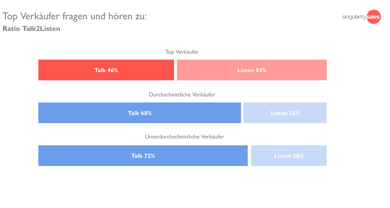 Die besten Vertriebsmitarbeiter hören mehr zu, als sie reden. Schlechte Verkäufer reden 72 % der Zeit, während Spitzenverkäufer nur 46 % der Zeit reden.