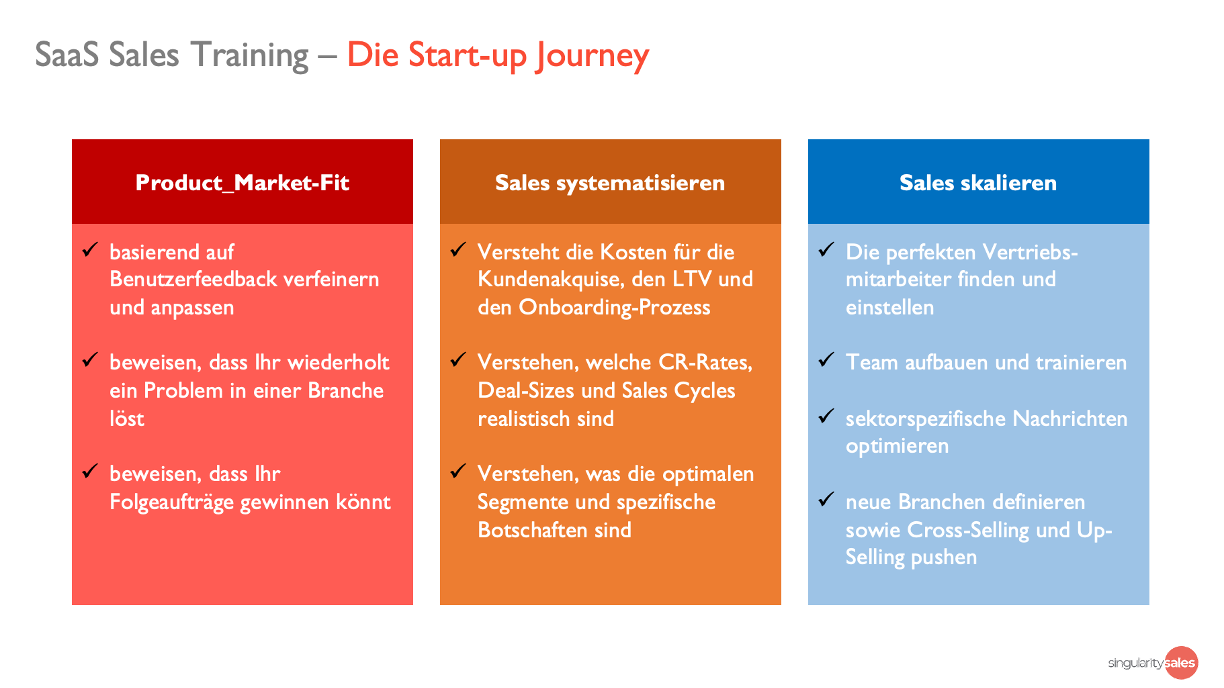 B2B-SaaS-Vertriebstrainings sind auf jeden Fall je nach Stadium des Startups signifikant zu unterscheiden. Die Strategie und die Fähigkeiten, die in Stufe 1 "Product-Market-Fit" erforderlich sind, unterscheiden sich von denen in Stufe 3 "Skalierung".