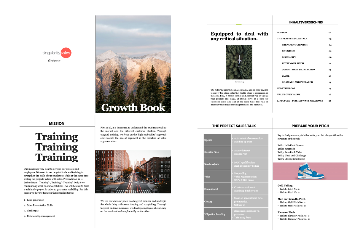 Wir empfehlen, alle Schulungen in einem elektronischen B2B Sales Playbook zu dokumentieren. Dieses Dokument wird ein lebendiges, funktionierendes Dokument, das ständig aktualisiert und verfeinert wird. Es wird dazu führen, dass Euer Sales-Team steig an Reife gewinnen wird.